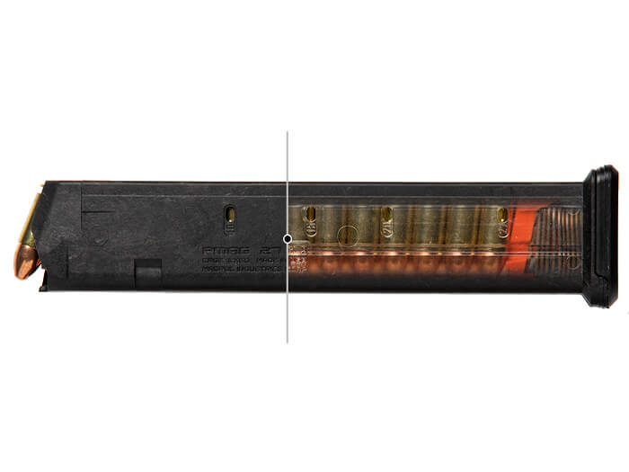 מחסנית PMAG 27 GL9 היא מחסנית 27 כדורים איכותית ל־GLOCK בקליבר 9 מ״מ, המיוצרת מבניה פולימרית מלאה ומתקדמת של Magpul, המבטיחה אמינות מקסימלית ועמידות לאורך אלפי יריות. המחסנית עומדת בדרישות האורך של מחסניות תחרות 170MM, כך שניתן לקבל קיבולת מוגדלת ללא צורך בהתקני הארכה יקרים. תכונות עיקריות מבנה פולימרי חזק במיוחד לשימוש אינטנסיבי. עוקב (Follower) בצבע בולט למניעת תקלות והטייה. קפיץ איכותי מנירוסטה לעבודה חלקה ויציבה. פלטה תחתונה נשלפת בקלות לניקוי ותחזוקה. משטח ייעודי לסימון עם טוש (Paint Pen Dot Matrix). קצוות מחוספסים לשיפור האחיזה בזמן שליפה. חלונות אינדיקציה המראים את כמות הכדורים שנותרה. נופלת חופשי (Drop Free) מלאה – עם או בלי כדורים. התאמה לדגמים מתאימה לכל דגמי ה־GLOCK הכפולי־שורה (Double Stack) בקליבר 9 מ״מ: מלאים, קומפקטיים וסאב־קומפקטיים — עם בליטה קלה מתחת לידית, בהתאם לדגם. פרטים נוספים ייצור: ארה״ב – Made in USA
