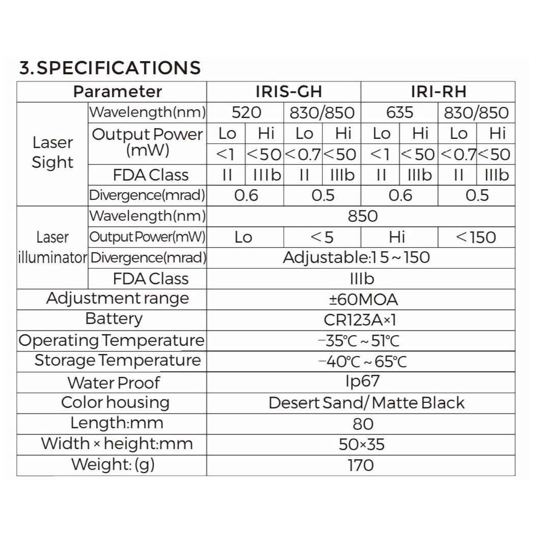 ה- Holosun IRIS-3-HP הוא ציין לייזר מתקדם, הכולל פנס אינפרא-אדום סמוי, ציין לייזר גלוי וציין לייזר IR – כל זה בגוף אלומיניום מוקשח 7075. קל יותר, נמוך יותר ומשופר מהדור הקודם, ה-IRIS-3-HP מספק עוצמה מרשימה עם נוחות שימוש מקסימלית. מרפט מקוצר : • IR Illuminator: 60mW VCSEL • IR Laser: 50mW VCSEL • Green/Red Laser: 50mW • Battery Type: CR123A • Weight: 6.4oz